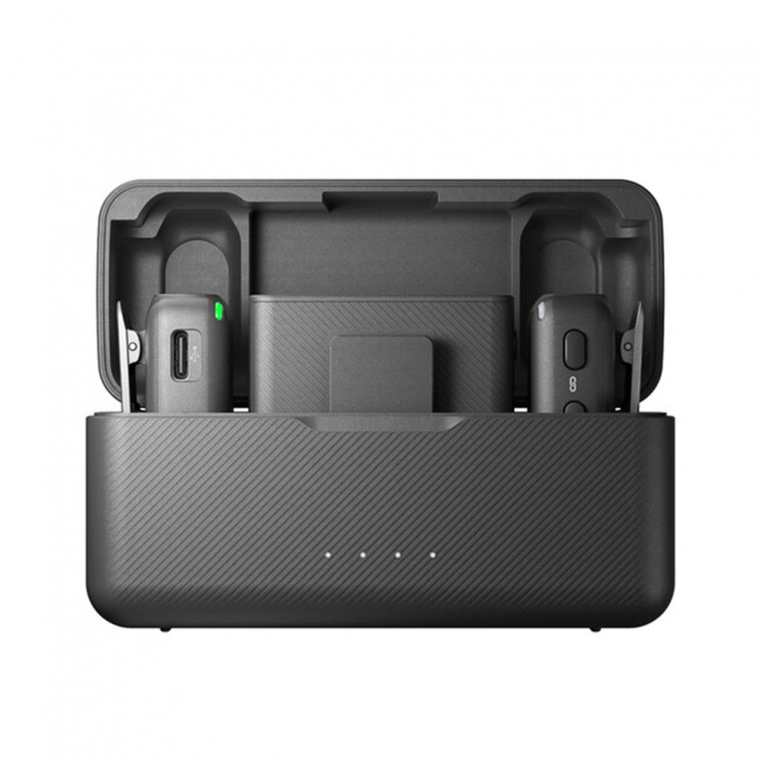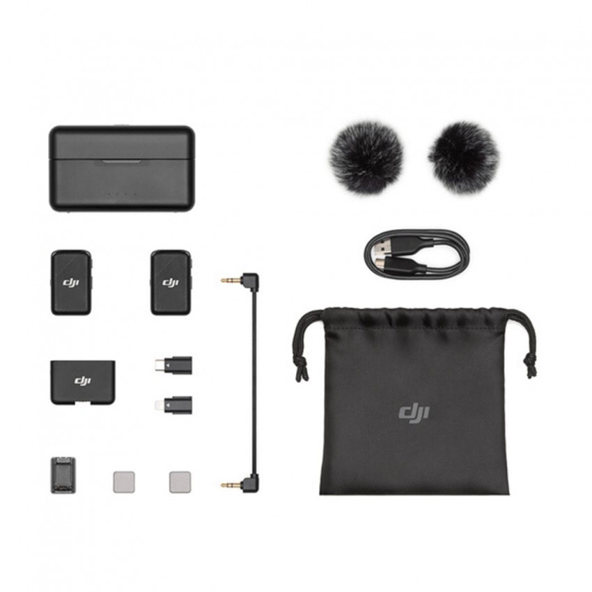 · In the box : x1 DJI Mic Receiver, x2 DJI Mic Transmitter, x1 DJI Mic Charging Case, x1 DJI Mic Camera Audio Cable (3.5mm TRS), x1 DJI Mic Mobile Phone Adapter (Type-C), x1 DJI Mic Mobile Phone Adapter (Lightning), x2 DJI Mic Windscreen, x2 DJI Mic Clip Magnet, x1 DJI Mic Carrying Pouch, x1 DJI Mic Hot Shoe Adapter, x1 Charging Cable